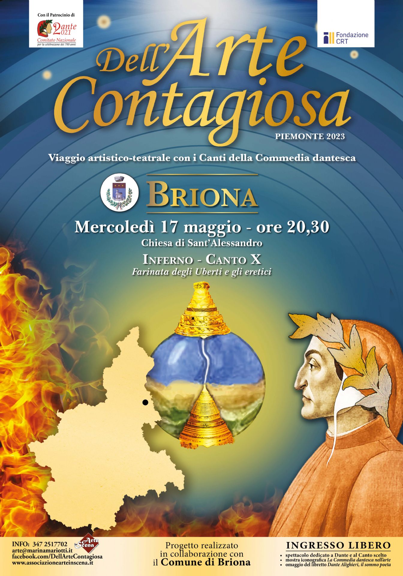 Mercoledì 17 maggio alle 20.30 presso la Chiesa di Sant'Alessandro al Cimitero, il Comune di Briona con l'Associazione Arte in Scena presenta Dell'Arte Contagiosa, un viaggio artistico-teatrale con i Canti della Commedia Dantesca.