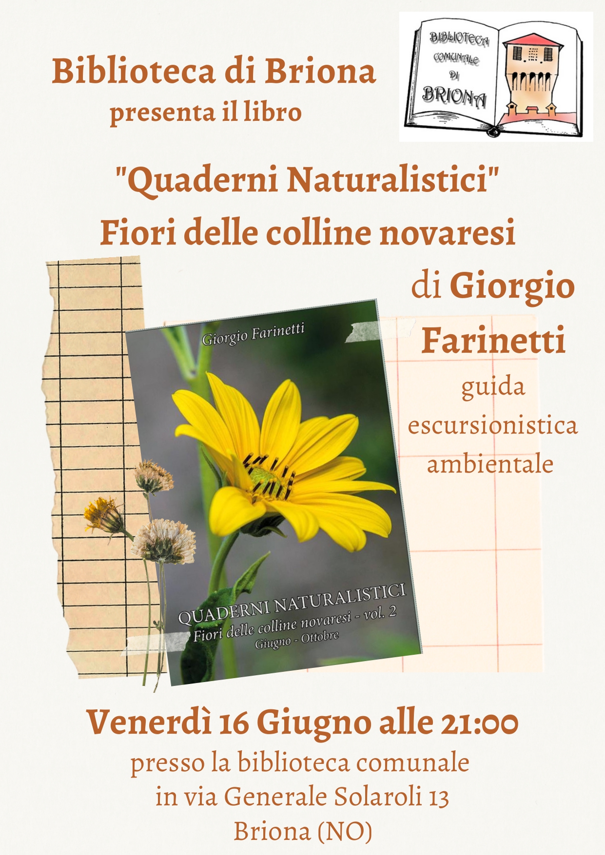 La Biblioteca di Briona vi invita venerdì 16 giugno alle ore 21.00 presso la biblioteca comunale in Via G. Solaroli 13 alla presentazione del libro "Quaderni Naturalistici - Fiori delle Colline Novaresi" di Giorgio Farinetti, guida escursionistica ambientale.