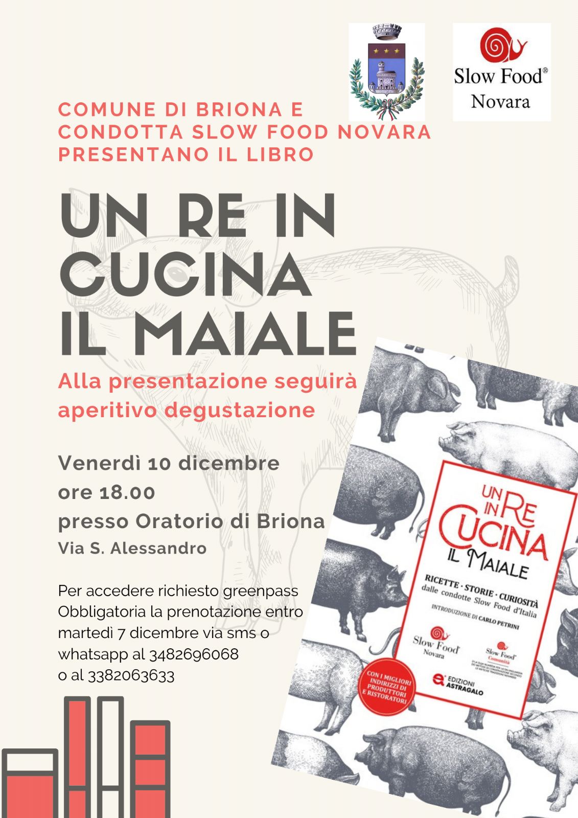 Il Comune di Briona e la Condotta Slow Food Novara organizzano per venerdì 10 dicembre alle ore 18, presso il salone dell'Oratorio di Briona, la presentazione del libro "Un Re in Cucina - Il Maiale". Alla presentazione seguirà un piccolo aperitivo-degustazione. E' richiesta la prenotazione via sms/whatsapp al 3482696068 o al 3382063633 entro martedì 7 dicembre. Per l'accesso obbligo di greenpass.