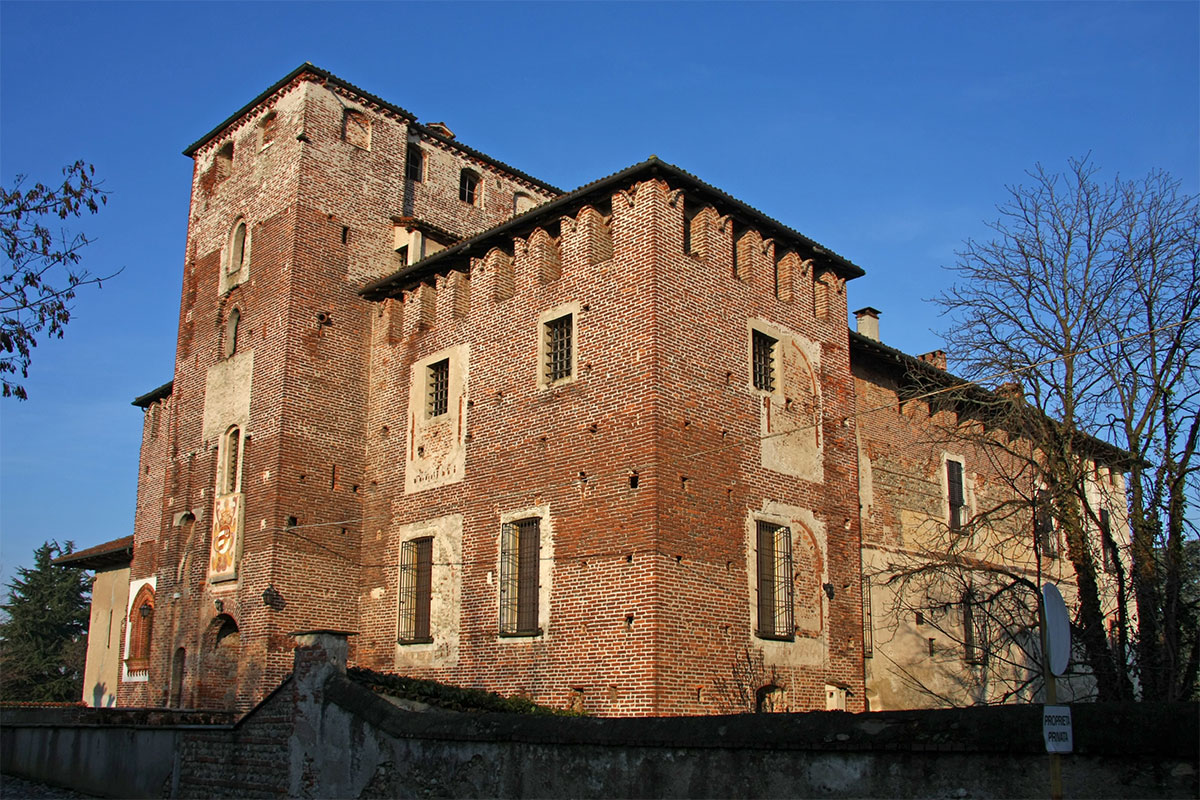 Il Castello di Caltignaga presenta una fossa attorno, con una porta grande, ponti levatoi, corte e pozzo.