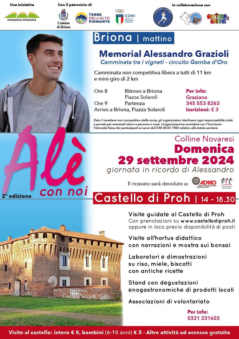 Anche per il 2024 il Comune di Briona è ente patrocinatore della giornata "ALE' con noi", la seconda edizione dell'evento per ricordare Alessandro Grazioli, che si terrà domenica 29 settembre.