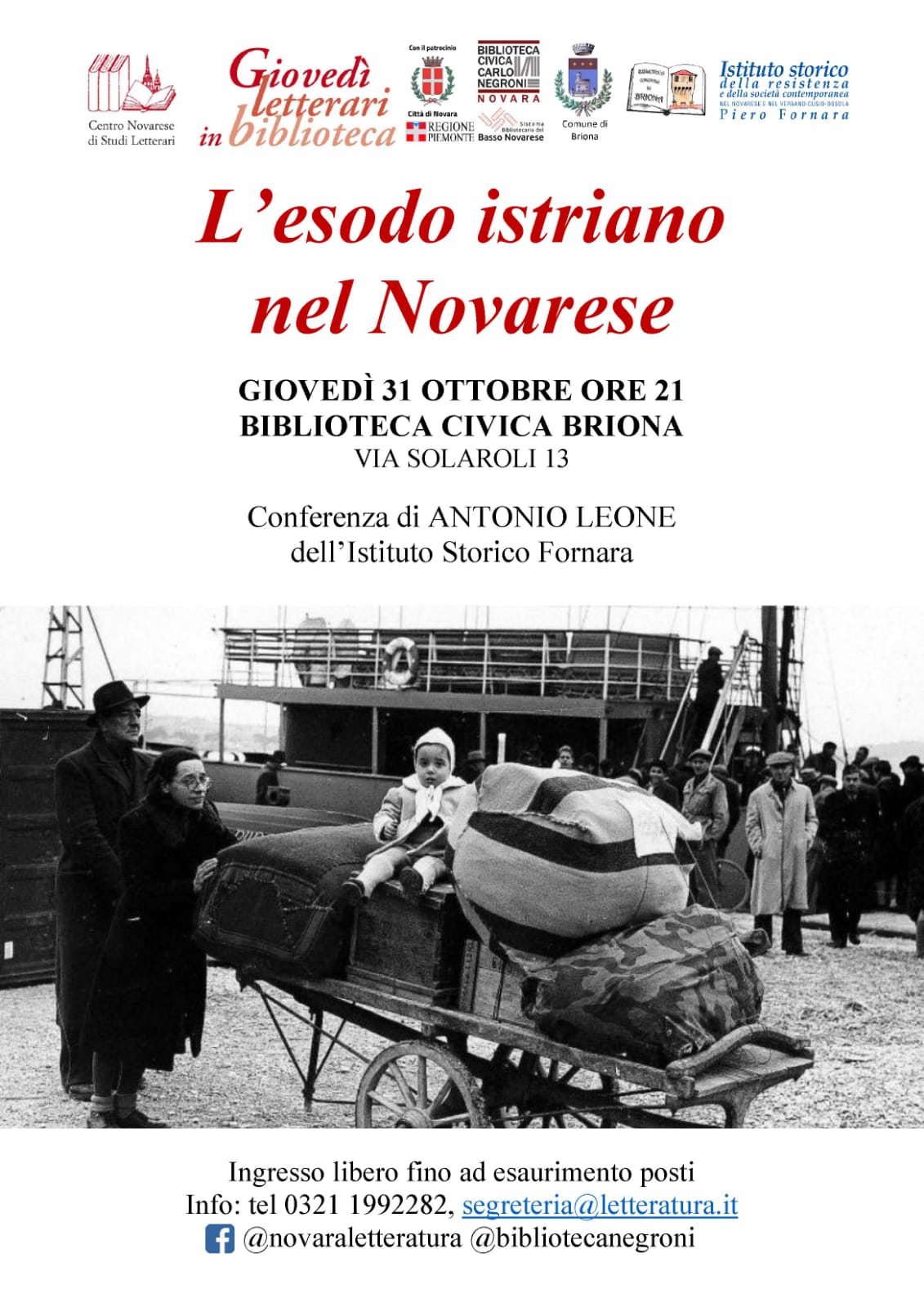 Per le iniziative per i 70 anni dalla posa della prima pietra del Villaggio Dalmazia, con i Giovedì letterari in Biblioteca organizzati dalla Biblioteca Civica "Carlo Negroni" di Novara e nell'ambito del Sistema Bibliotecario Basso Novarese, giovedì 31 ottobre alle ore 21 si terrà presso la Biblioteca "G. Tornaco" di Briona la conferenza "L'esodo istriano nel Novarese", a cura di Antonio Leone, vice presidente dell'Istituto Storico "P. Fornara".