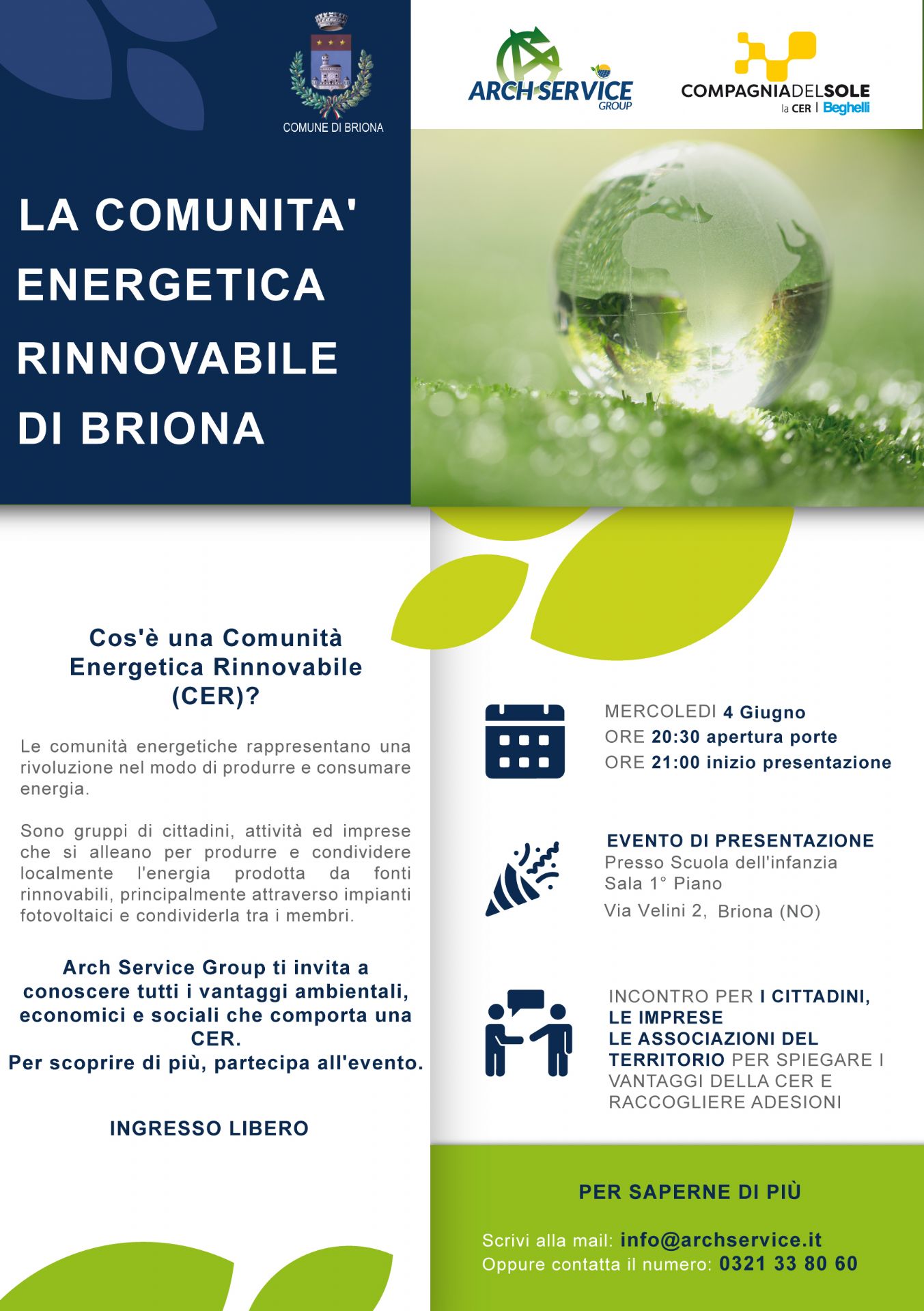 Mercoledì 4 giugno alle ore 21.00 si terrà a Briona, presso la sala comunale in via Velini 2, un incontro di presentazione della Comunità Energetica Rinnovabile "CER Italy", al quale il Comune di Briona ha aderito, con l'assistenza tecnica di Arch Service Group.