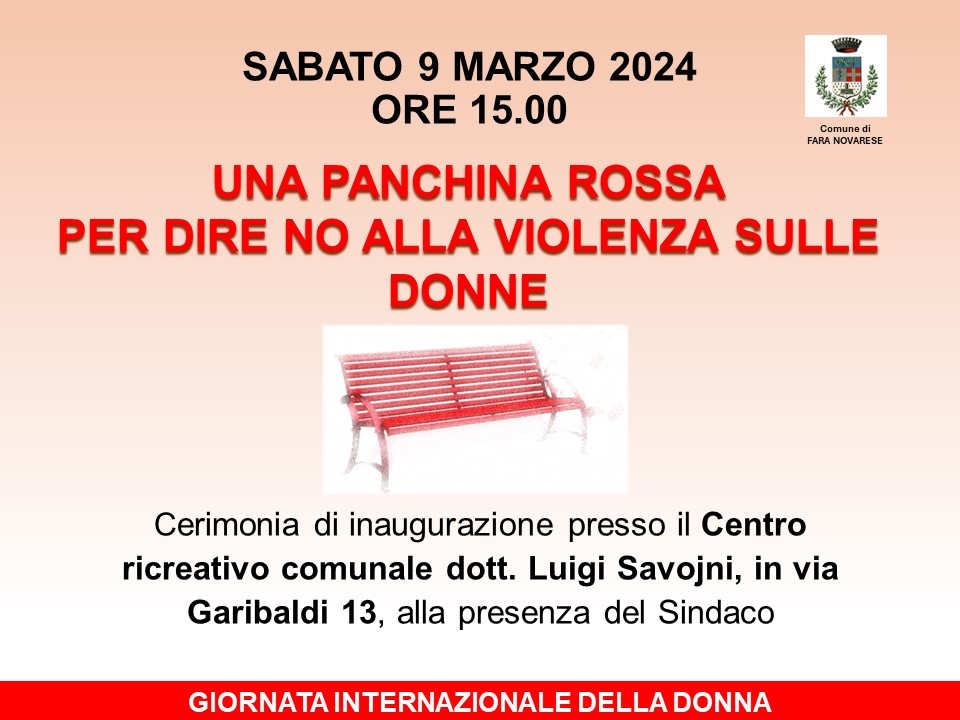 In occasione della Giornata Internazionale della Donna, il giorno sabato 9 marzo 2024, alle ore 15,00, si terrà l'inaugurazione di una panchina rossa contro la violenza sulle donne, presso il Centro ricreativo dott. Luigi Savojni in via Garibaldi 13